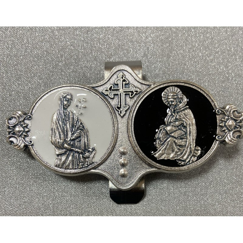 Car Blessing with Saint Catherine and Saint Dominic, Dominican Cross. Metal. Made in Italy. Applies to sun visors or air vents. 2 3/4" long. Attaches with a clip on the back side.